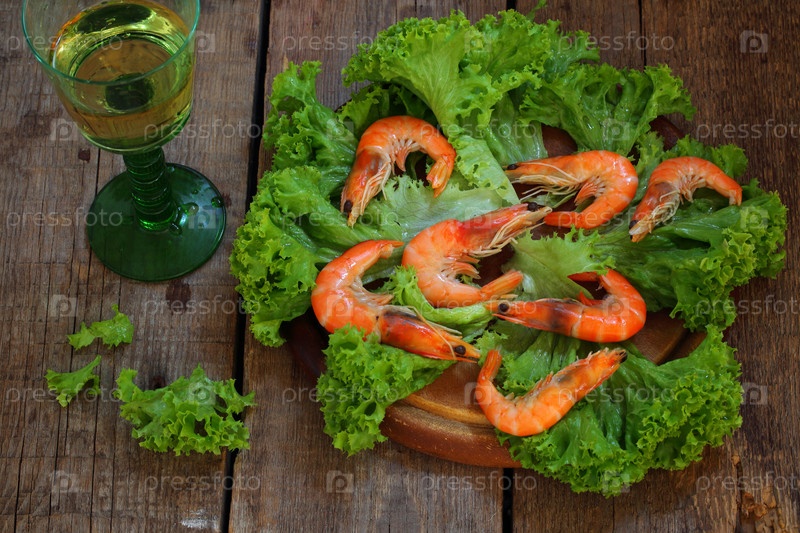Королевские креветки с белым вином на деревянном фоне