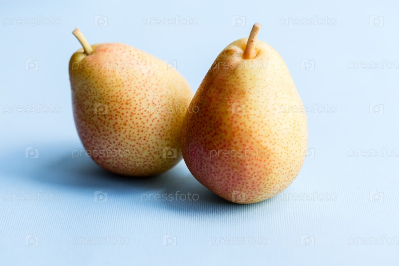 Две желтые груши на голубом фоне. Фрукты для веганской диеты