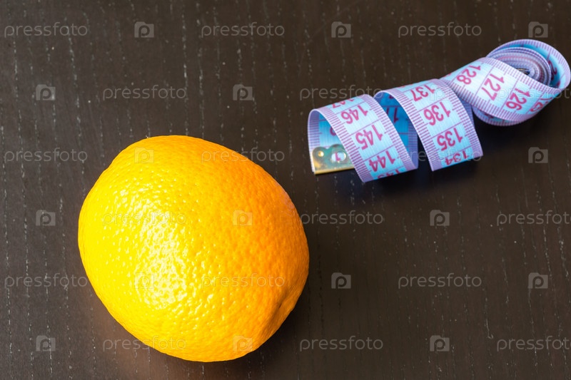 Апельсин с измерительной лентой на черном фоне, здоровый образ жизни, диета и спортивная концепция