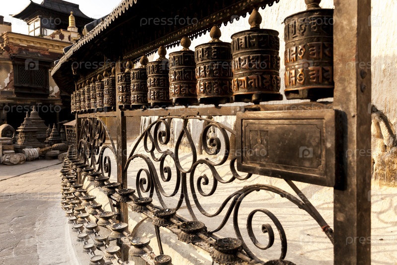 Тибетские молитвенные барабаны из металла в храме Сваямбунатх - Храм обезьян, Катманду, Непал