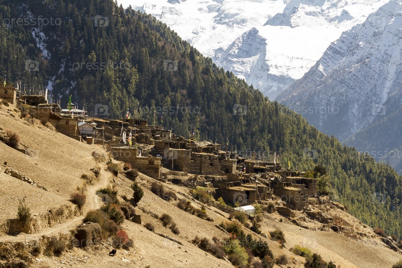 Азиатская горная маленькая деревня Непал, Гималаи, заповедник Аннапурны