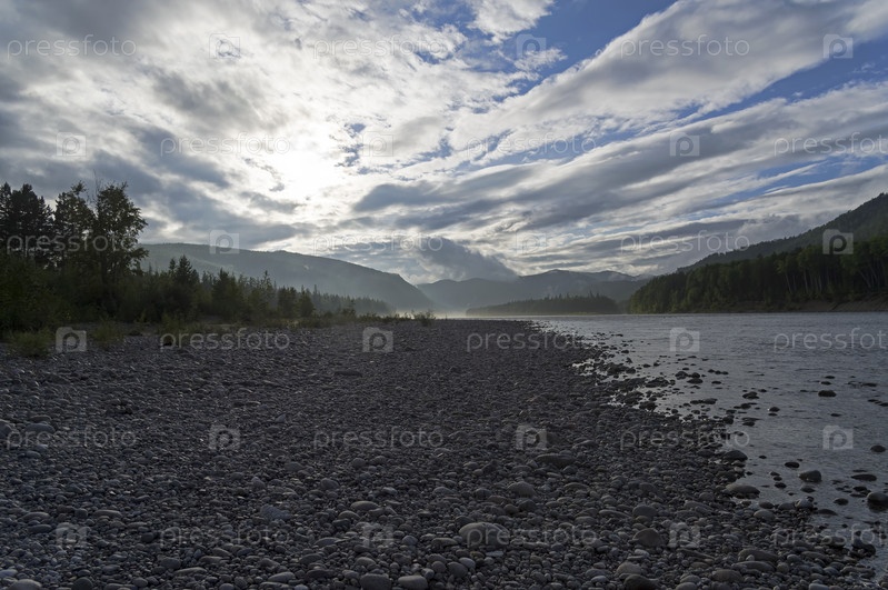 Облака над долиной реки Ока Саянская. Иркутская область, Сибирь, Россия. Август