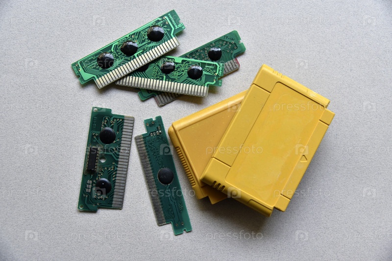 Электронная плата картриджа для игровой приставки в стиле ретро. Желтый пластиковый картридж на черном фоне и электронная плата