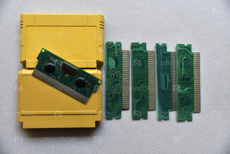 Электронная плата картриджа для игровой приставки в стиле ретро. Желтый пластиковый картридж на черном фоне и электронная плата