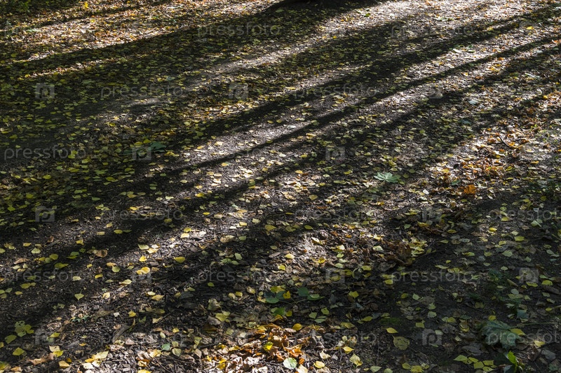 Фон, образованный опавшими осенними листьями и пятнами солнечного света и тени