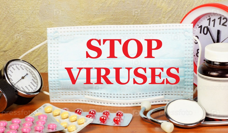 Остановить вирусы. Надпись на фоне лекарств и стетоскопа. Гигиеническая защита от вирусных и бактериальных инфекций