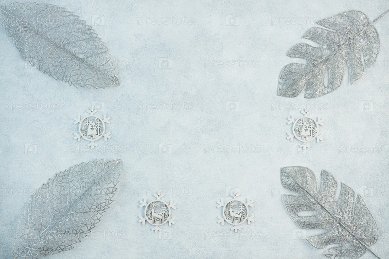 Концепция праздничного фона в серебристых тонах. Вид сверху на серебряные шарики из подарочной коробки на сером фоне. Макет фона новогодних праздников с местом для копирования