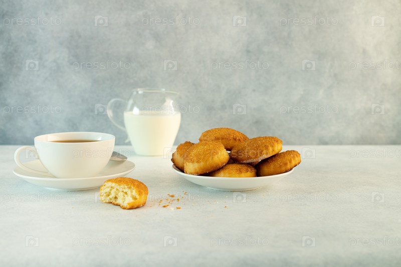 Вкусная закуска: чашка черного чая с молоком и тарелка печенья на сером фоне