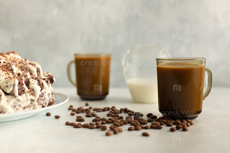 Кофе со сливками в стеклянной кружке с кофейными зернами, кремовый торт. Напиток на светло-сером фоне