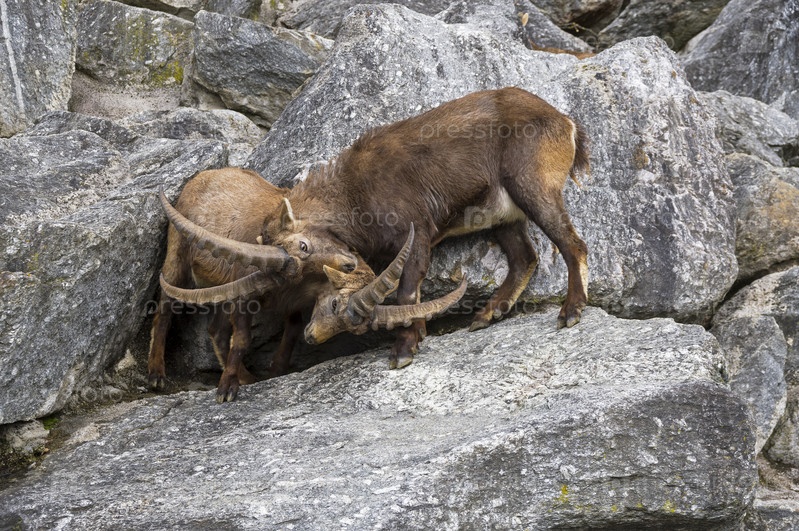 Два альпийских козыря, или ибекса рожают (лат. Capra ibex).Альпийский зоопарк, Инсбрук, Австрия