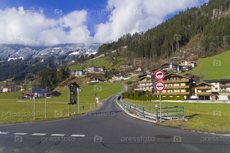 Боковая дорога уходит вверх в горы от основного шоссе. Долина Циллерталь, Тироль, Австрия, солнечный день в начале марта