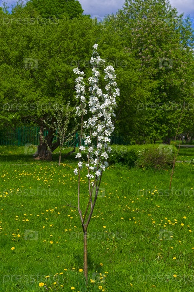 Маленькая цветущая яблоня. Яблоневый сад в Коньково, Юго-Западный административный округ Москвы, солнечный день в мае