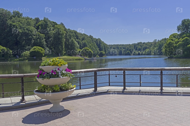Вид на Верхний Царицынский пруд с плотины, отделяющей его от Среднего Царицинского пруда. Царицынский парк, Москва, Россия, Солнечный день в июне