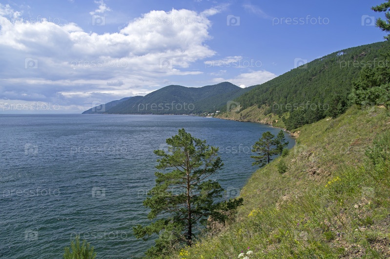 Сосны на крутом высоком берегу озера Байкал. Иркутская область, Россия. Солнечный день в августе