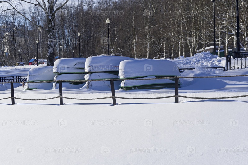 Заснеженные перевернутые лодки на закрытой на зиму лодочной станции. Теплостановский лесопарк, Москва, Россия. Солнечный день в феврале