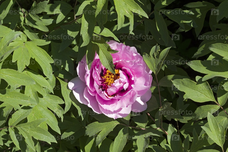 Цветущий розовый древовидный пион. Солнечный день в конце мая. Аптекарский Огород (филиал ботанического сада МГУ), Москва