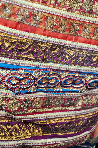 Индийская красивая ткань крупным планом. Вышивка тканью. Индия