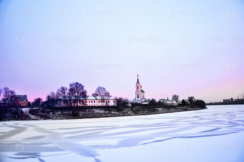 Екатерининский монастырь зимой. Набережная реки Волги. Тверь зимой. Россия