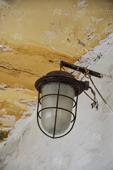 Уличный потолочный светильник. Старая ржавая лампа. Старая стена