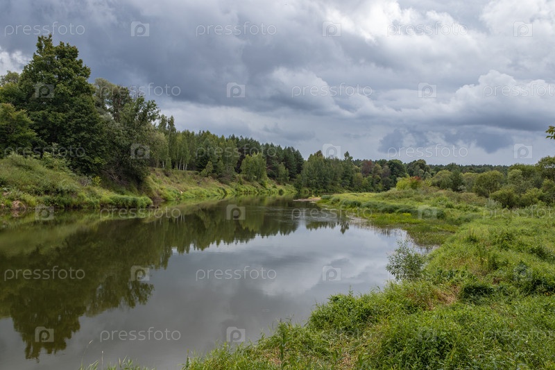 Летний пейзаж на берегу реки, пасмурный день. Калужская область, Россия