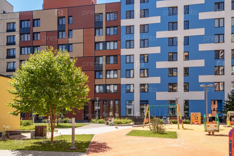 Современный многоквартирный дом с красочными фасадами на окраине города. Жилой комплекс «В лесу», Москва, Россия