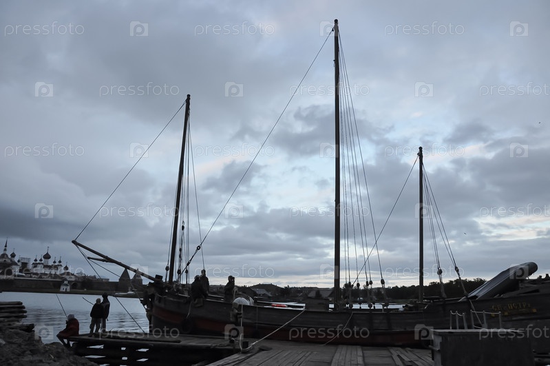 Корабль на закате. Вечер. Соловецкие острова. Белое море. Россия