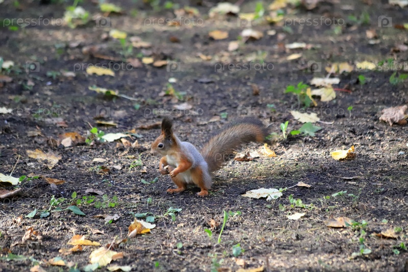 Белка в парке угощается от посетителей