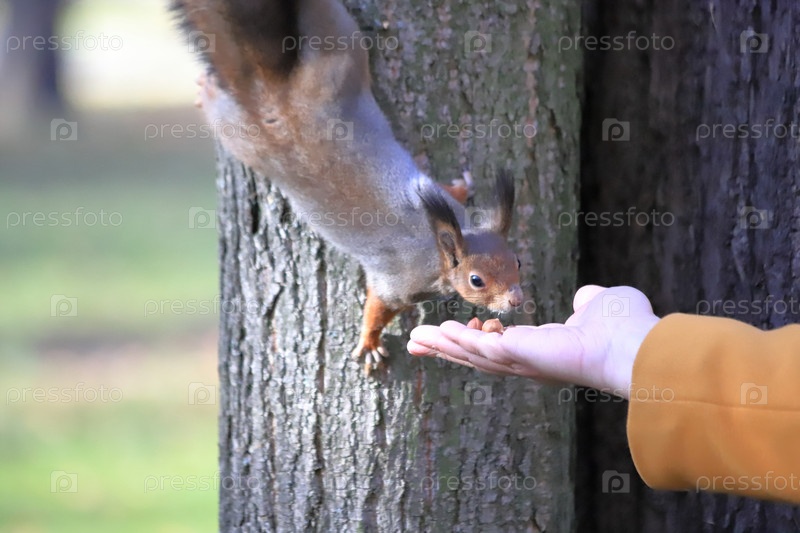 Белка в парке угощается от посетителей