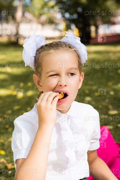 Милая маленькая школьница аппетитно ест наггетсы на пикнике в парке. Школьное питание. Вертикальный вид