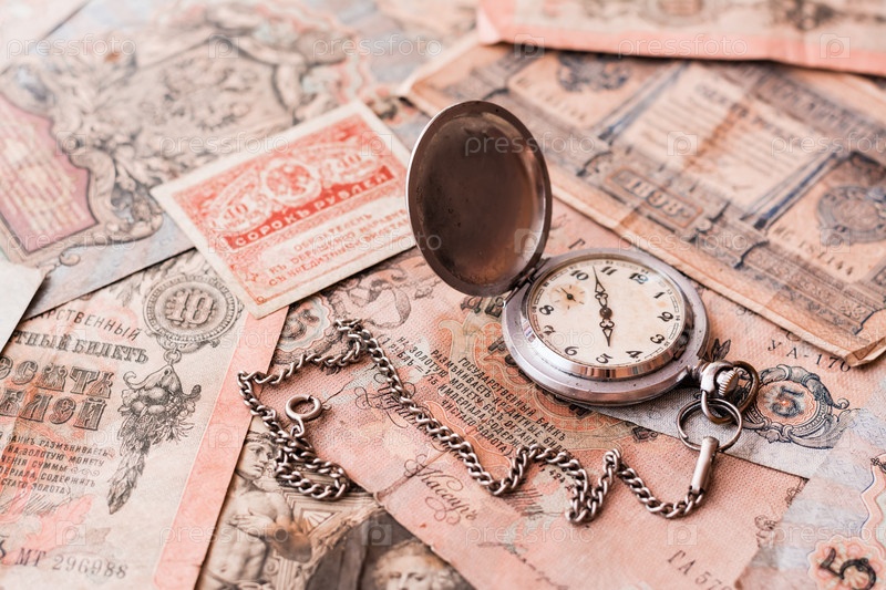 Старинные часы на цепочке лежат на старых рублевых банкнотах, вышедших из обращения на коричневом фоне