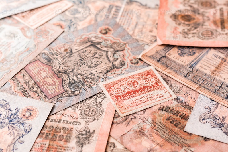 Хаотично разбросанные старые изношенные рублевые банкноты царской россии