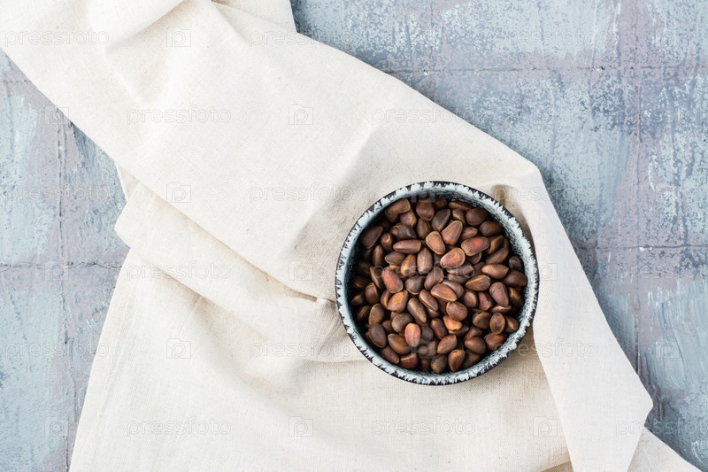Кедровые орехи в миске на скатерти на столе. Вегетарианская пища. Оздоровление, детоксикация и витаминное питание