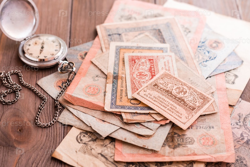 Стопка старых устаревших рублевых купюр и потертые часы на цепочке на деревянном столе