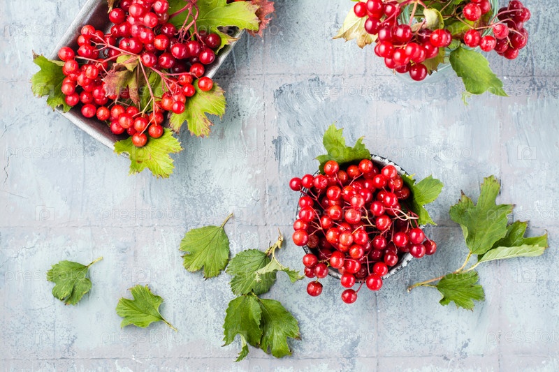 Спелые ягоды калины с листьями в миске на столе. Велнес, альтернативная медицина и витаминное питание. Вид сверху