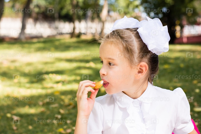 Милая маленькая школьница аппетитно ест наггетсы на пикнике в парке. Школьное питание. Копировать пространство
