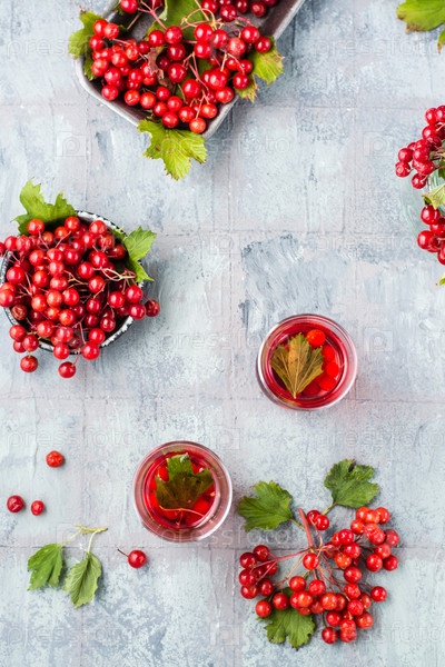 Отвар спелых ягод калины в прозрачных стаканах и ягод калины в пиалах рядом со столом. Альтернативная медицина, витаминное питание и велнес. Верхний и вертикальный вид
