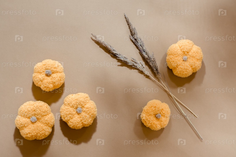 Осенний натюрморт ручной работы вязаные тыквы и сушеные колосья на картоне. Пастельные тона. Спокойное и теплое настроение