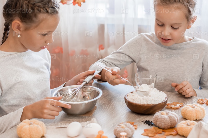 Две милые девушки взбивают пряничное тесто, чтобы приготовить печенье на хэллоуин на домашней кухне. Угощения и подготовка к празднованию Хэллоуина