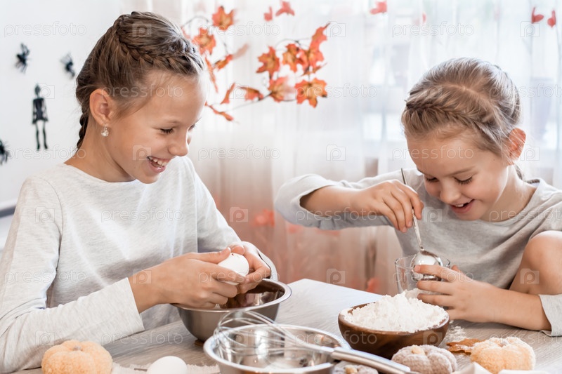 Две милые девушки кладут яйца и муку в пряничное тесто для выпечки печенья на хэллоуин на домашней кухне. Угощения и подготовка к празднованию Хэллоуина