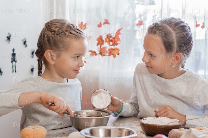 Угощения и подготовка к празднованию хэллоуина. Две девушки готовят хэллоуинское печенье в тесте для выпечки на кухне