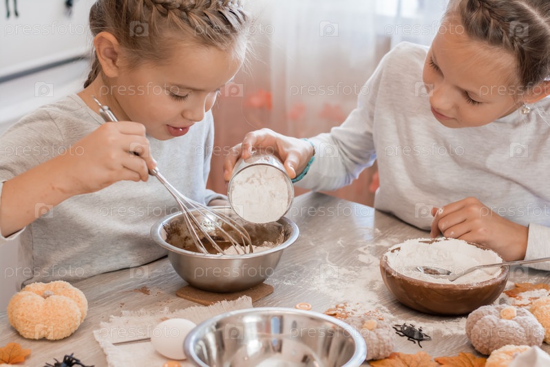 Подготовка к празднованию хэллоуина и приготовление угощения. Две девушки готовят печенье на хэллоуин в тесте для выпечки дома на кухне