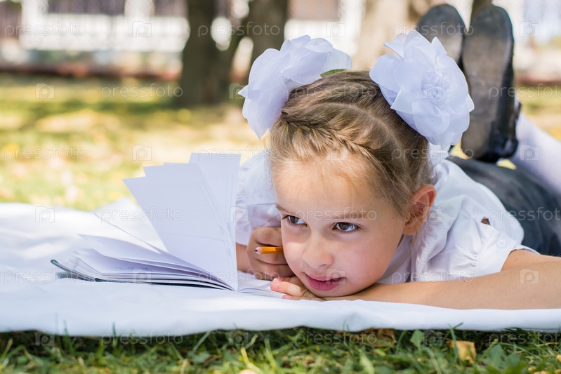 Крупным планом портрет маленькой школьницы, делающей домашнее задание, лежа на одеяле в солнечном осеннем парке. Обучение детей на свежем воздухе. Вернуться к школьной концепции