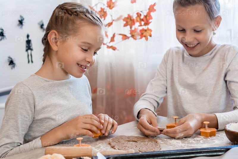 Подготовка к празднованию хэллоуина и приготовление угощения. Милые девушки смотрят на вырезанное из теста хэллоуинское печенье и улыбаются на домашней кухне. образ жизни