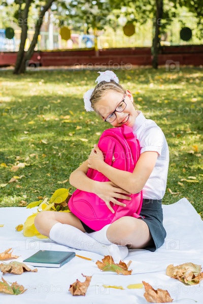 Симпатичная школьница в очках улыбается и обнимает рюкзак, сидя на одеяле в солнечном осеннем парке. Вернуться к школьной концепции. Вертикальный вид