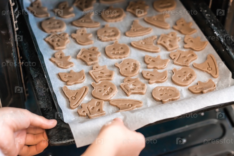Подготовка к празднованию хэллоуина и приготовление угощения. Руки вставляют в духовку противень с сырым печеньем на Хэллоуин. образ жизни