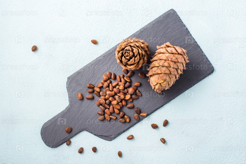 Неочищенные кедровые орехи и шишки на грифельной доске. Дары Сибири. Детокс и лечение бессонницы. Здоровое витаминное питание. Вид сверху
