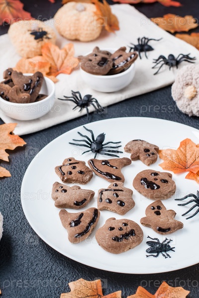 Готовое угощение на хэллоуин - пряничное печенье с шоколадной глазурью на тарелке на столе. Сладкая еда. Вертикальный вид