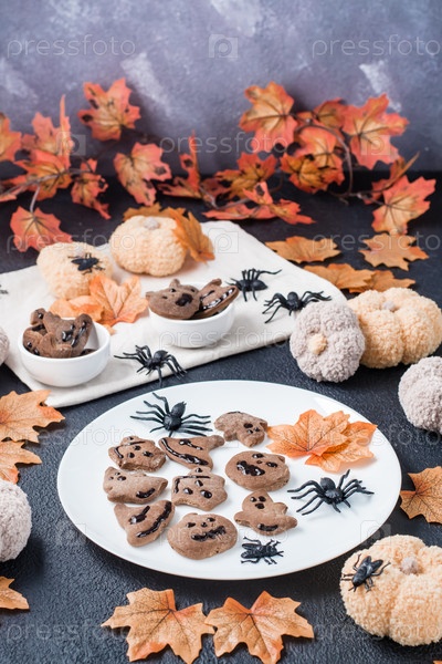 Готовое угощение на хэллоуин - пряничное печенье с шоколадной глазурью на тарелке на столе с тыквами и листьями. Традиционный праздник. Вертикальный вид
