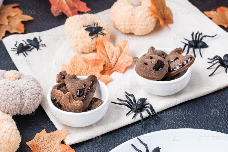 Вкусное угощение на Хэллоуин - пряники с шоколадной глазурью в мисках на столе с тыквами и листьями. Традиционный праздник, сладкая еда