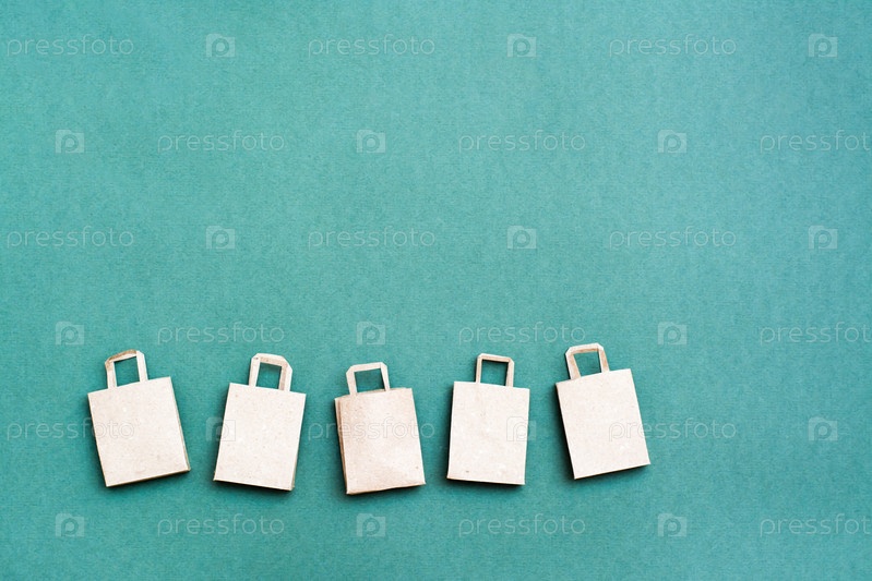 Экологически чистые бумажные сумки для покупок подряд на зеленом фоне. Черная пятница распродажа подарков. Копировать пространство